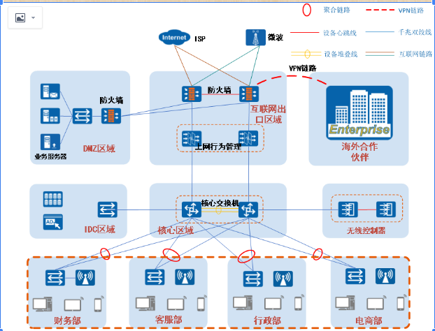 整體采用區(qū)域化設(shè)計,分別分為互聯(lián)網(wǎng)出口區(qū)域、DMZ業(yè)務(wù)區(qū)域、辦公區(qū)域、IDC區(qū)域等