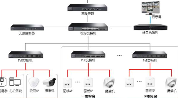 本方案為客房、大廳分別配備對(duì)應(yīng)的無(wú)線AP,保證各層、各個(gè)客房的無(wú)線全覆蓋;樓道配備半球監(jiān)控,大廳或室外配備筒形攝像機(jī);各層通過(guò)PoE交換機(jī)為AP和攝像機(jī)供電,只需要給對(duì)應(yīng)點(diǎn)位提供網(wǎng)線接口即可。 炫億時(shí)代