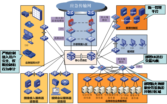 應急數據中心是應急業(yè)務系統(tǒng)的物理載體,采用分區(qū)、分層、分級的設計思路,良好的擴展性充分滿足各個子系統(tǒng)分階段建設的要求;核心交換區(qū)雙機熱備滿足可靠性和高交換性要求;在外聯網接入區(qū)、應急綜合應用服務器區(qū)、管理控制區(qū)的高安全分級滿足核心業(yè)務的保護要求;基于以太網的統(tǒng)一交換架構打通了數據中心前后端的網絡平面,也使得容災實現手段更多樣化、更易于部署,進一步提高了數據中心的可靠性