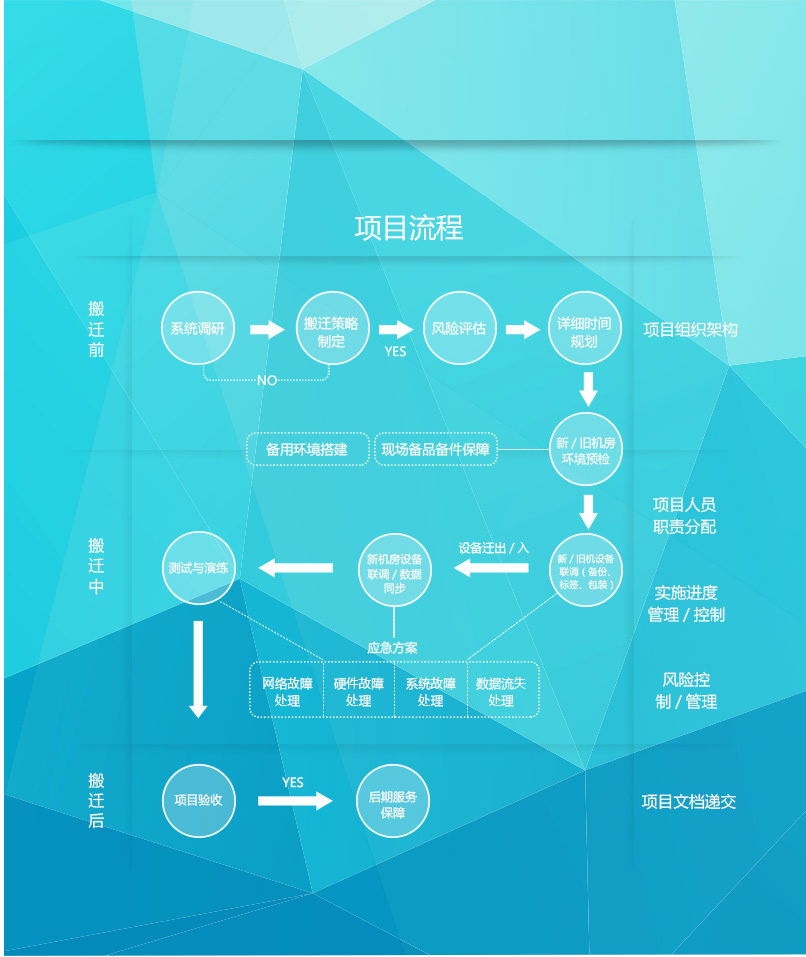 云爍經(jīng)驗豐富的搬遷項目經(jīng)理進行項目勘察、周密組織、高效實施。 完備的搬遷方案,確保用戶系統(tǒng)平滑遷移。